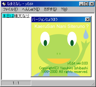 C++Builderの練習用に作ったエディタですが, 「メモ帳」と同程度の機能を持たせてあります。 メニューはすべて仮名表記で, 1MBまでのファイルを扱うことができます。 動作確認は,Windows95/98/2000で行いました。 ドキュメントファイル: yeddoc.txt |