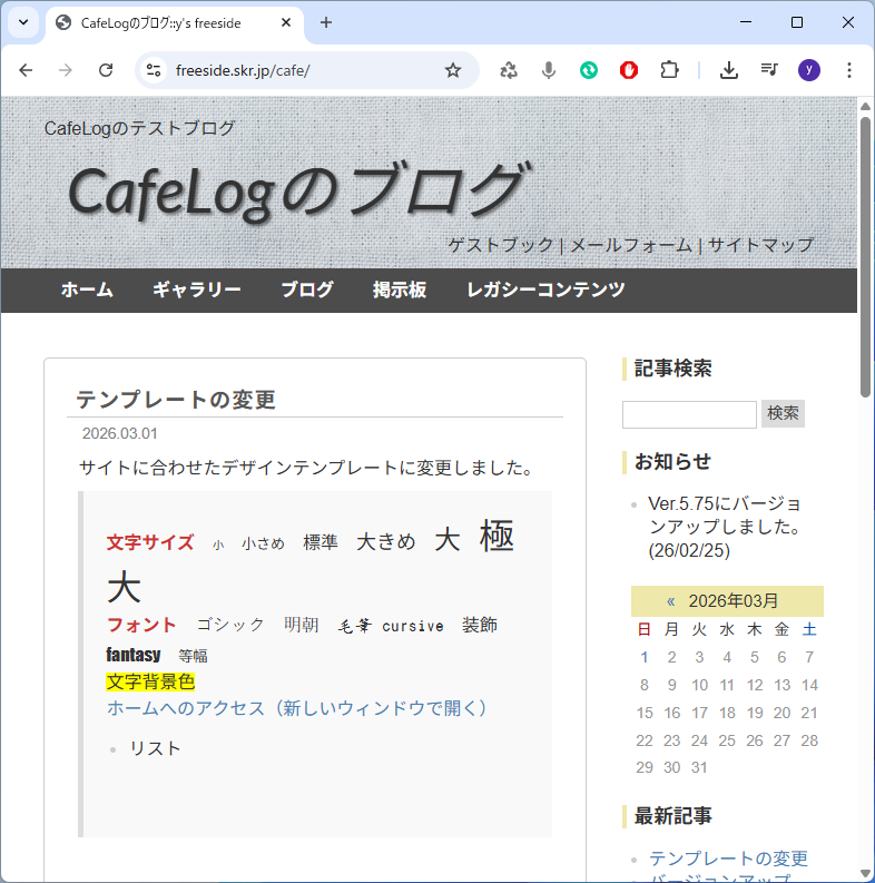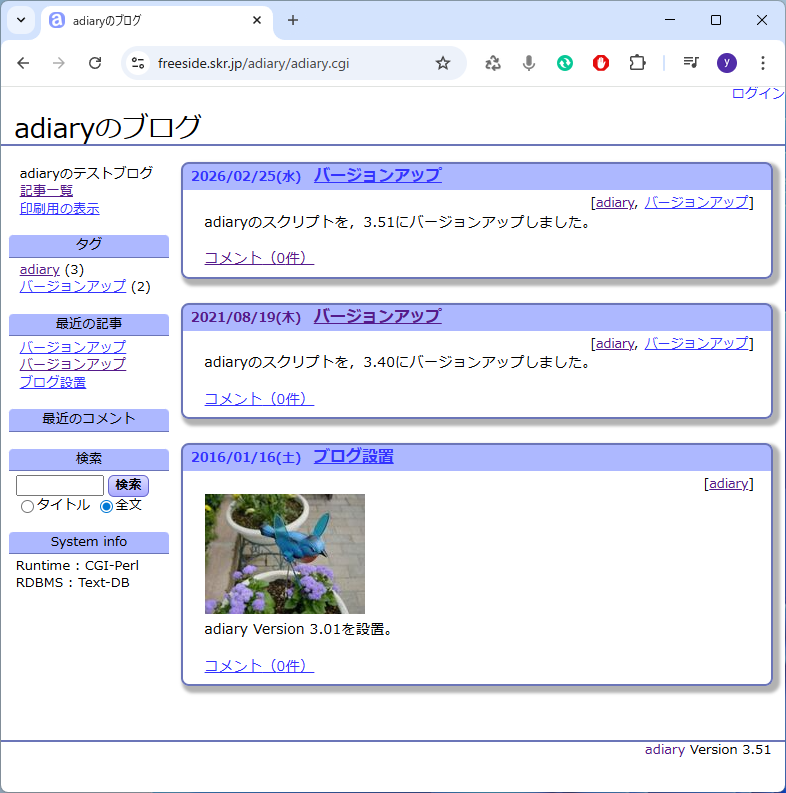 「tDiary」「ハイパー日記システム」と見直してきた流れで,同じように使っていなかった「adiary」「CafeLog」もメンテナス。使い勝手を確かめたくて試験的に設置していたスクリプトですが,とりあえず最新版にアップデートしておきました。CafeLogの方は,デザインテンプレートのカスタマイズもしていたので,今のサイトに合わせて作り直しました。