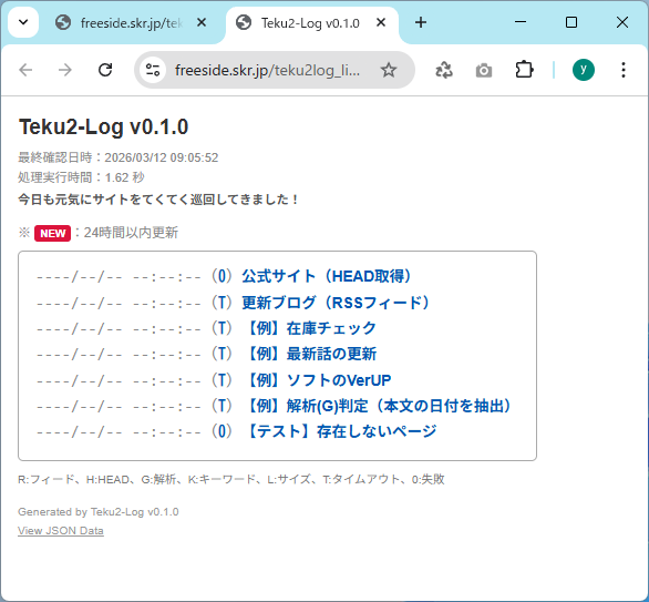 人間がブラウザで確認するためのHTML一覧と同時に,プログラムが読み取りやすいJSON形式のデータも自動で生成します。自作の通知ツールや別スクリプトとの連携など,データの二次利用が容易です。 - サイトの健康状態を判別する「ステータス表示」